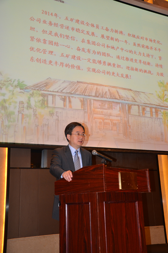 地产中心总经理田景琦到会并发表讲话,对五矿建设的工作给予充分肯定,并对新一年的工作过提出希望。会上,常务董事副总经理尹亮作了题为《新常态,新思路》的投资工作专题报告,系统阐述了在房地产行业的新常态下创新项目拓展模式的思路。副总经理何小丽作了财务工作专题报告,对2015年公司的财务管理工作了进行了重点部署。运营管理部副总经理王剑峰、营销总监段旻罡分别做了运营工作和营销工作报告。